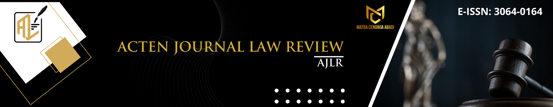 ACTEN JOURNAL LAW REVIEW (AJLR) is an open-access peer-reviewed scholarly journal (E-ISSN: 3064-0164) jointly organized and operated by PT. Matra Cendikia Abadi, domicile in Jember, Indonesia, in collaboration with Faculty of Law, University of 17 August 1945 Banyuwangi, domicile in Banyuwangi, Indonesia. The Journal which publishes original articles on the most recent knowledge, researches, or applied researches, and other developments. The published article is the result of a selection with a double anonymous peer review system. This journal publishes articles 3 (three) times a year, every April, August, and December.